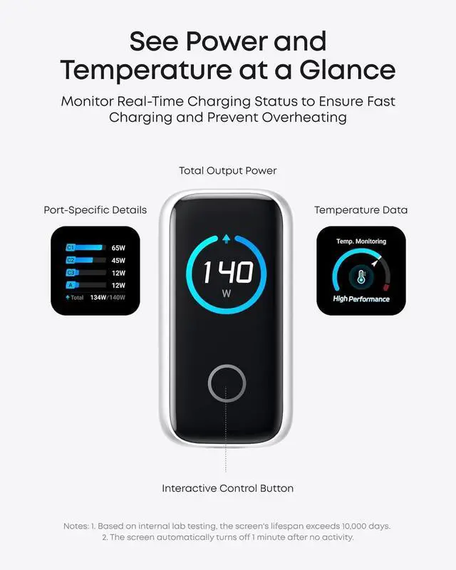 Monitor with Ease and Clarity: The high-definition color display provides a detailed view of the charging status, temperature, and port details, keeping you fully informed.