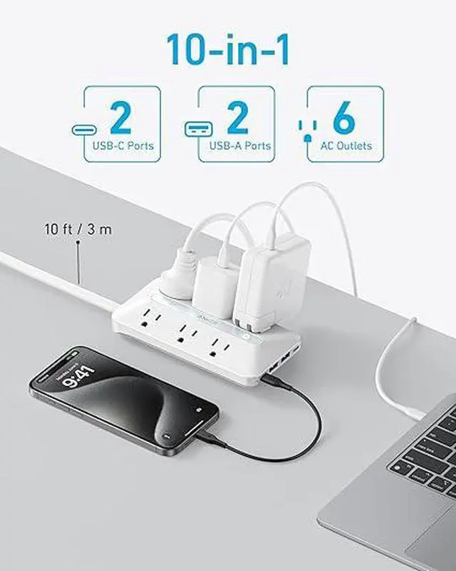 10-in-1 Power Hub: Equip yourself with 6 AC outlets, 2 USB-A ports, and 2 USB-C ports for efficient multitasking and quick charging.