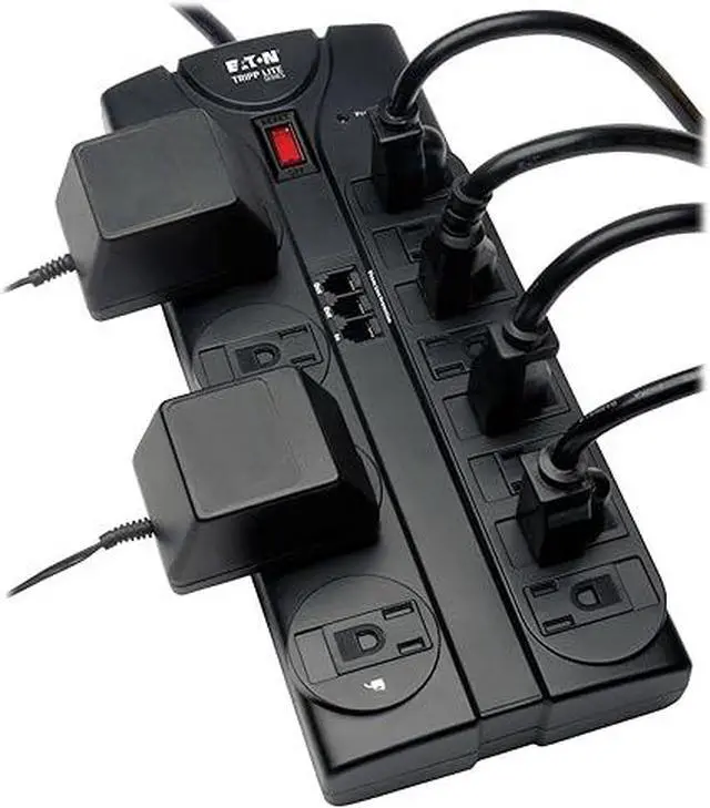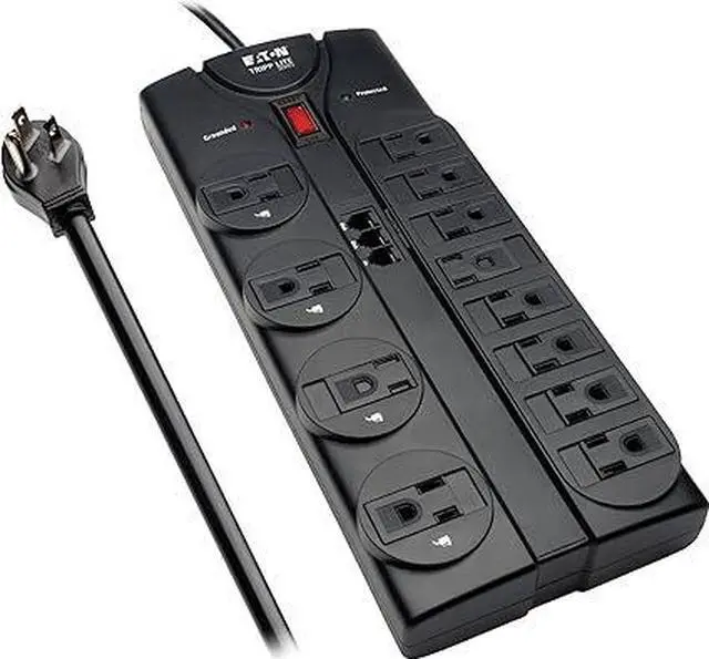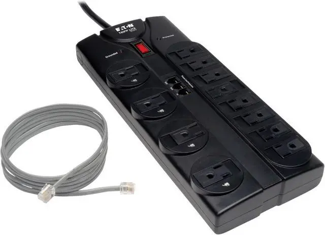 OFFICE SURGE PROTECTOR: Features 12 outlets, a robust 2160 joule rating, and an 8ft extension cord with a flat plug. Four outlets fit bulky transformers without blocking other outlets. Package includes a 6ft phone line (RJ11) cable.