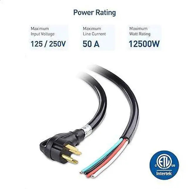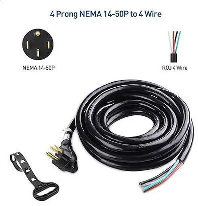 4. Rugged & safe 4 prong 50 Amp RV Cord with a NEMA 14-50P power plug and un-terminated insulated wires; Color-coded wires with Black/Red - Hot, Green - Ground and White - Neutral make the installation simpler and safer
