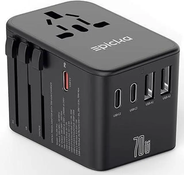 Universal Travel Adapter, GaN International Plug Adapter with 3 USB-C 70W PD Fast Charging & 2 USB-A Adaptor All-in-one Wall Charger for USA EU UK AUS (TA-105 Pro, Black)
