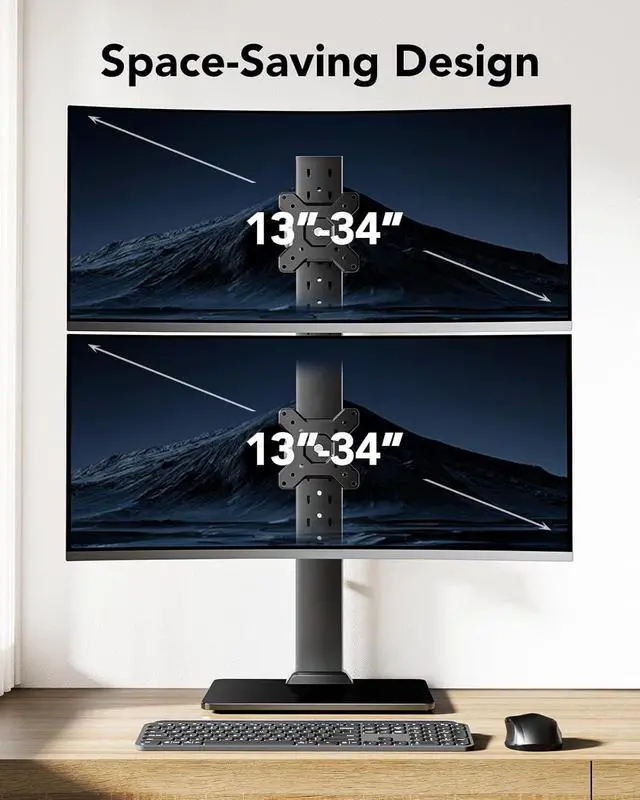 Fits 13 to 34 Screens: This HUANUO vertical monitor stand fits two 13-34 screens with VESA mounting patterns of 50x50mm, 75x75mm or 100x100mm. Whether using a flat, curved or ultra-wide screen, this dual monitor stand offers support up to 44 lbs.