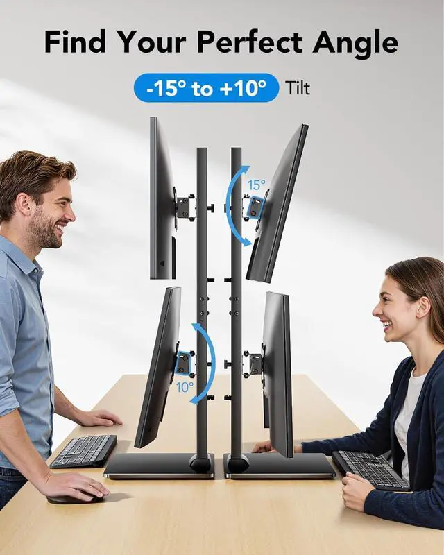 View From Any Angle: Our dual monitor mount enables customizable viewing with a tool-free tilt range of -15° to +10° and a +/-50° swivel for both monitors. Rotate smaller monitors 360° on the stand for portrait or landscape in an instant.