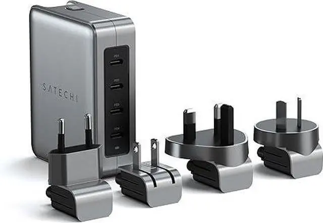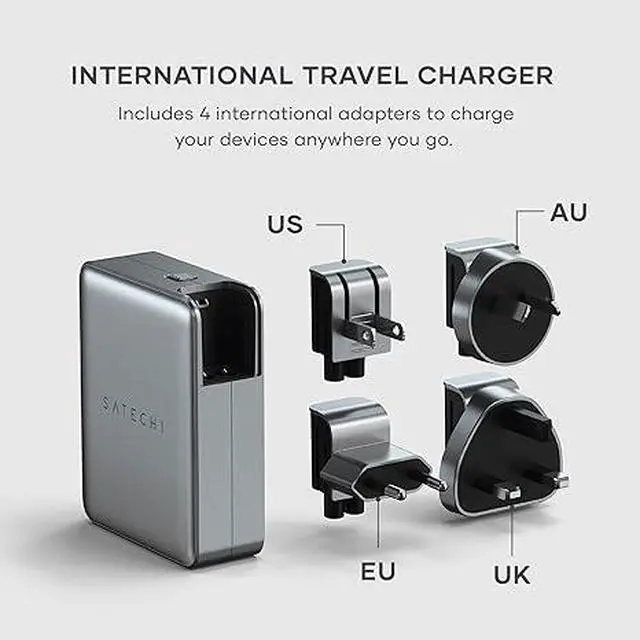Whats Included - The GaN travel charger includes four interchangeable international adapters (EU/AU/UK/US), a mesh carrying bag, customer support, and a user manual for easy installation. Charging cables sold separately. Satechi products are covered by a 2-year limited warranty against defects in materials and workmanship under normal use