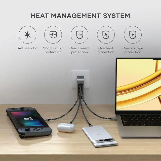 Advanced GaN Technology Featuring cutting-edge GaN technology with graphene insulation, the compact and lightweight GaN USB C charger efficiently prevents heat buildup, ensuring a cooler exterior during operation. As a potent charging solution, it efficiently powers high-demand devices such as the 16-inch MacBook Pro, Legion Slim 7i, and Legion 7i, making it an ideal travel companion.