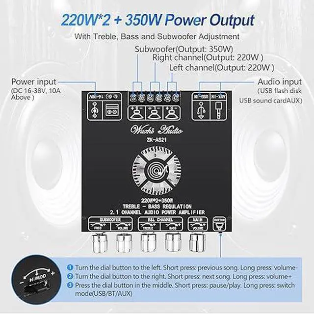 220W*2 + 350W High Power Output This AS-21 audio amplifier has 220W*2 output power for left and right channel and 350W output power for subwoofer, it can drive two high-power speakers (30-220W, 3-8 ohms) and one subwoofer (30-350W, 2-8 ohms), and the adapted power supply is DC16-38V/10A or above. Note: The higher the power supply voltage/current, the higher the output power, the lower the speaker resistance, the higher the output power, the adapted power supply should higher than the actual working power of the amplifier