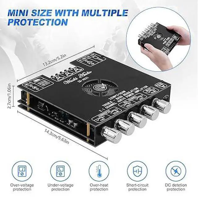 With Protective Function This Bluetooth Amp module is designed with multiple protection mechanisms, include over-voltage protection, under-voltage protection, over-heat protection, short-circuit protection, with case to protective it. Besides, There is a Long-life Ultra Silent Fan(locked rotor, no burning,no noise) above audio chips, for heat dissipation and protection of Bluetooth amplifier board