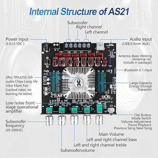 2.1 CH Subwoofer Audio Amplifier Board This AS-21 power amplifier is 2.1channel, allows you to connect 2 passive speakers and drive a subwoofer, comes with Treble and Bass buttons, independent subwoofer volume adjustment buttons and 20-200Hz subwoofer frequency adjustment buttons, which is very friendly for audiophiles, you can adjust the Treble and Bass buttons, make the bass more shocking and the treble clearer, make the sound more layered