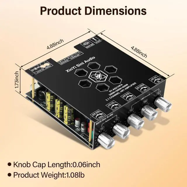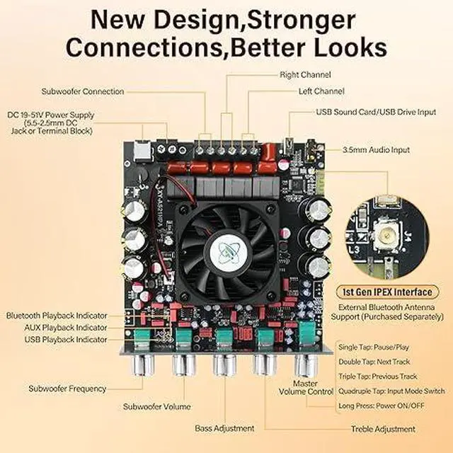 AS21HPA 2.1 Channel Bluetooth Amplifier Board, 300W*2+600W Peak Power Home Audio Amplifier Board, Amp Wide Voltage Input 19-51V,Supports USB/AUX/BT Input for DIY Wireless Speaker