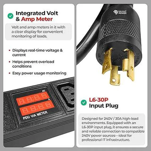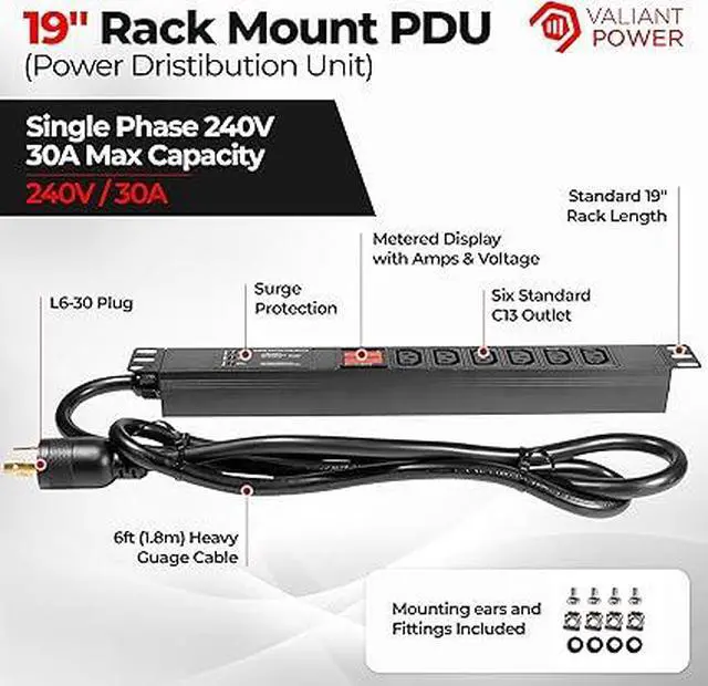 Rack Mount Power Strip - 240V 30A Single Phase PDU with Built-in Surge Protector, Volt & Amp Meter for Data Center - 19 Metal Housing, Ears & Fittings Included, 6 Cable, 6 Outlets