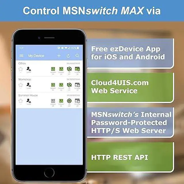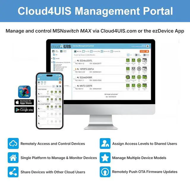 REMOTE POWER SWITCH: Power-cycle equipment from anywhere using the ezDevice smartphone app, web browser, or API, streamlining troubleshooting and maintenance