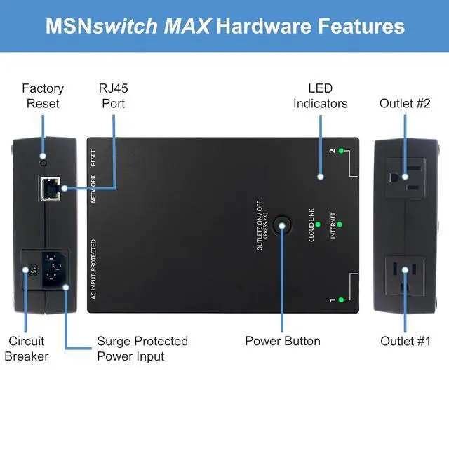 MSNswitch MAX 2-Outlet Internet Enabled Power Switch with Auto Reboot, Power Metering, Surge Protection & Noise Filtration - Ethernet & WiFi - Control via Smartphone, Cloud or API (Model UIS-801bc)