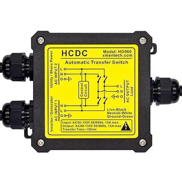 HCDC HD060 Automatic transfer switch, an easy to mount 15Amp inline transfer relay provides switching between AC INPUT 2 (Utility or Shore Power) and AC INPUT 1 (Inverter or Generator) AC source. When AC INPUT 2 is powered, the load power will be switched to AC INPUT 2. When AC INPUT 2 is powered off, the load power will be switched to AC INPUT 1.