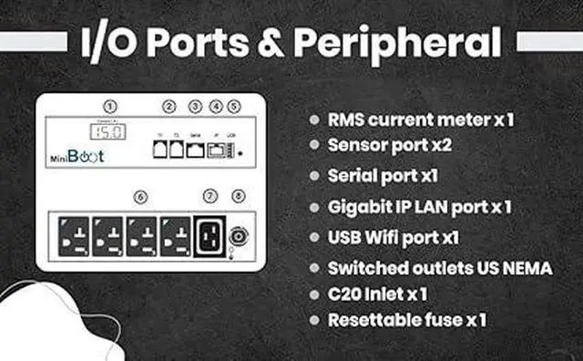 ALERTS / ALARMS > Receive alerts via SNMP, email (SMTP), and syslog when predefined thresholds are exceeded for both MiniBoot and environmental sensor events. > Common SNMP MIBs (Management Information Base) for all MiniBoot models. Sensors & Wi-Fi > Variety of optional sensors: Temperature & Humidity, Temperature, Smoke, Door. > Option to connect via a Wi-Fi kit (IPD-WIFI) complying with 802.11 g/n/ac.