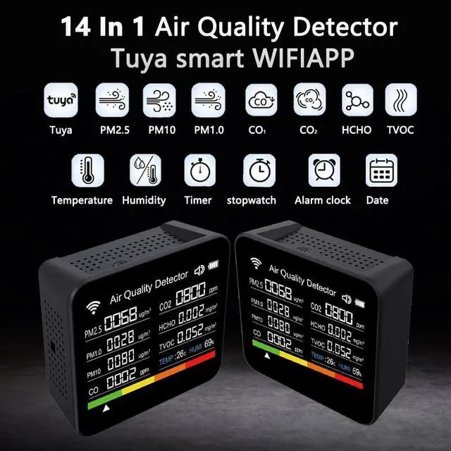 14-in-1 Air Quality Monitor, Indoor Temperature Sensors, Detect PM2.5/PM1.0/PM10/CO2/CO/TVOC/HCHO/Temperature/Humidity, Meter for RV Home Office School Hotel by DT