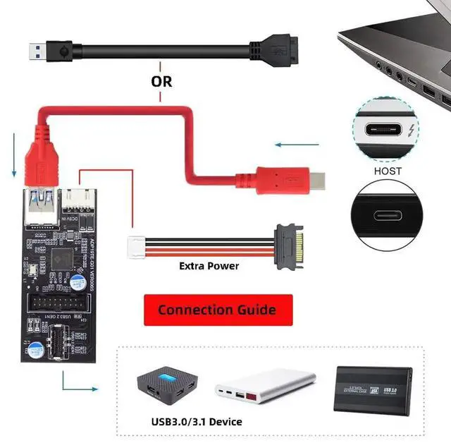 2)USB 3.2/3.1 require a different front panel header than USB 3.0. The adapteris a converter to convert the available USB-E Female of a motherboard into a USB 3.2/3.1 header. The Type-E port supports 5Gbps USB Data from SSD/HDD. Doesn't support any audio,video and docking output, Not work for any PD power, DP alt mode.