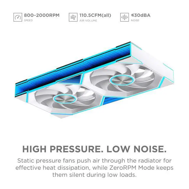 [Better Cooling]Aluminum integrated heat sink design improves cooling efficiency by 40%. It can handle up to 320W TDP, with fan speeds of 800 - 2000±10% RPM, three fans with a total airflow of 165.1CFM, and an air pressure of 2.05mmH2O, guaranteeing excellent overclocking-level cooling
