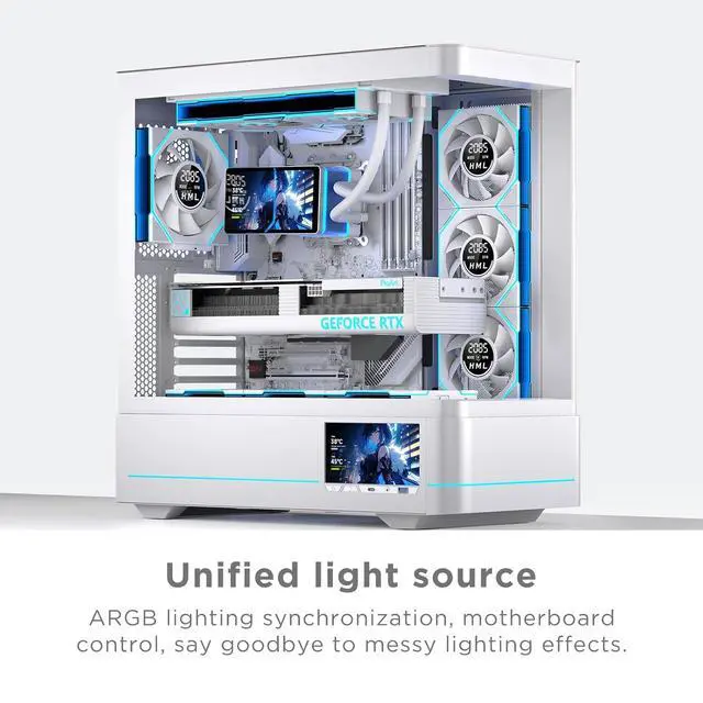 [ARGB Synchronized Lights]Siamese ARGB Infinity Mirror fans and dual-ring ARGB water-cooling headers are synchronized with the 5V 3pin on the motherboard, and 1600W colorful soft-lighting effects create cool visual effects. Transparent shell + dual halo surround, enhance the chassis value, realize the whole machine lighting effect unity