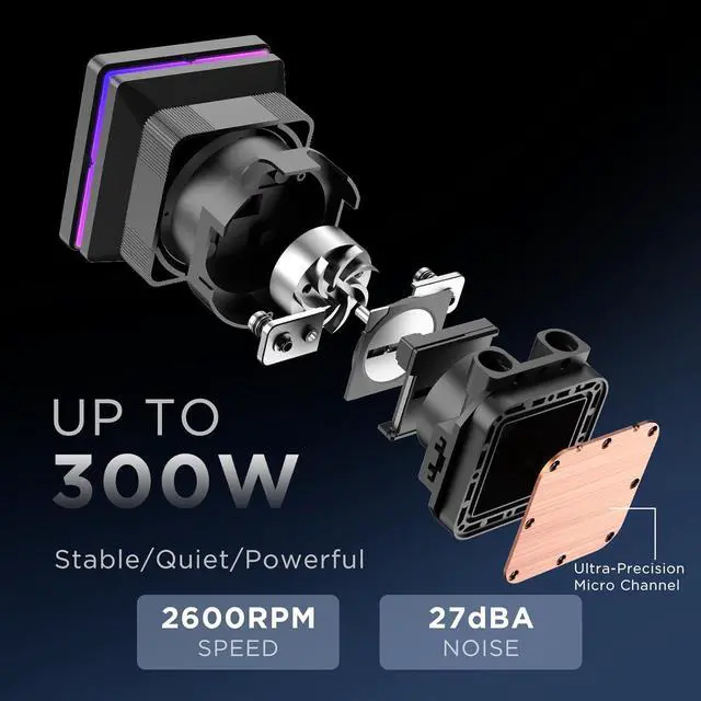 [Better Cooling]Aluminum integrated heat sink design improves cooling efficiency by 40%. It can handle up to 300W TDP, with fan speeds of 800 - 2000±10% RPM, three fans with a total airflow of 204.3CFM, and an air pressure of 2.04mmH2O, guaranteeing excellent overclocking-level cooling
