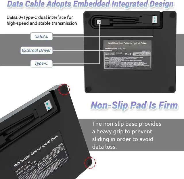 The cd rom external blu ray drive for laptop is also fitted with non-slip rubber feet for added stability and to reduce the risk of accidental slips or falls.