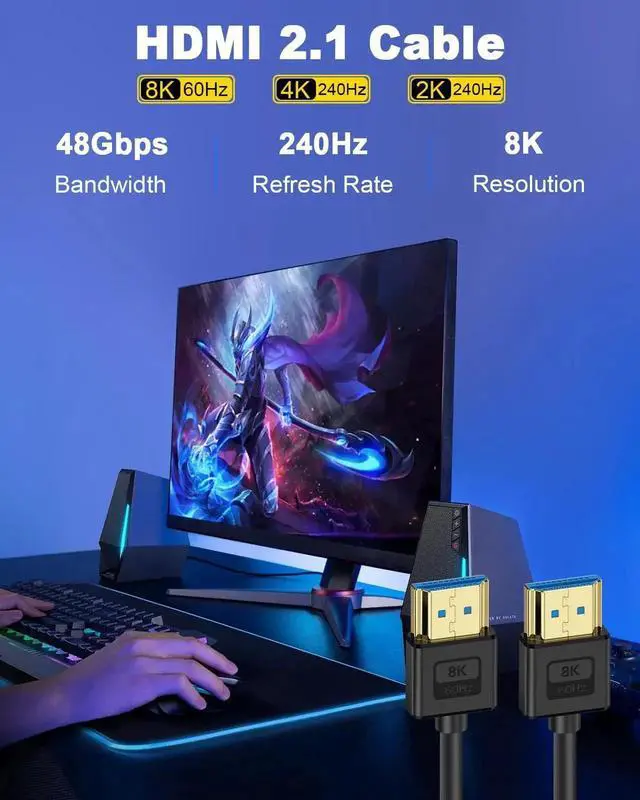 Ultra High Speed HDMI cable: This ultra-thin and flexible 8K HDMI to HDMI cable supports a bandwidth of 48Gbps, enabling smooth transmission of 8K@60Hz, 4K@120Hz/144Hz, and even future 10K resolutions (for some professional devices), as well as 3D, Ethernet, Audio Return Channel (ARC), HDR, and high-resolution audio formats. It is also backward compatible with 2K@165/144Hz and 1080P@240Hz.