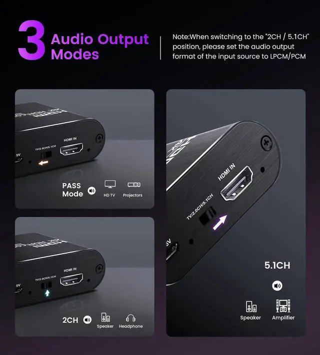 Three Audio Mode Settings: (Pass, 2CH and 5.1CH Mode) 3.5mm audio output supports incoming 2CH PCM LPCM stereo audio; Optical SPDIF output supports incoming 2CH PCM, 5.1CH DoblIy Digital, DoblIy TrueHD, DTS-HD. (Note: 1. Our product dont support DoblIy Digital plus and CEC function; 2. To receive audio from both Optical and L/R output ports, the input source device format must be set to PCM/stereo.)