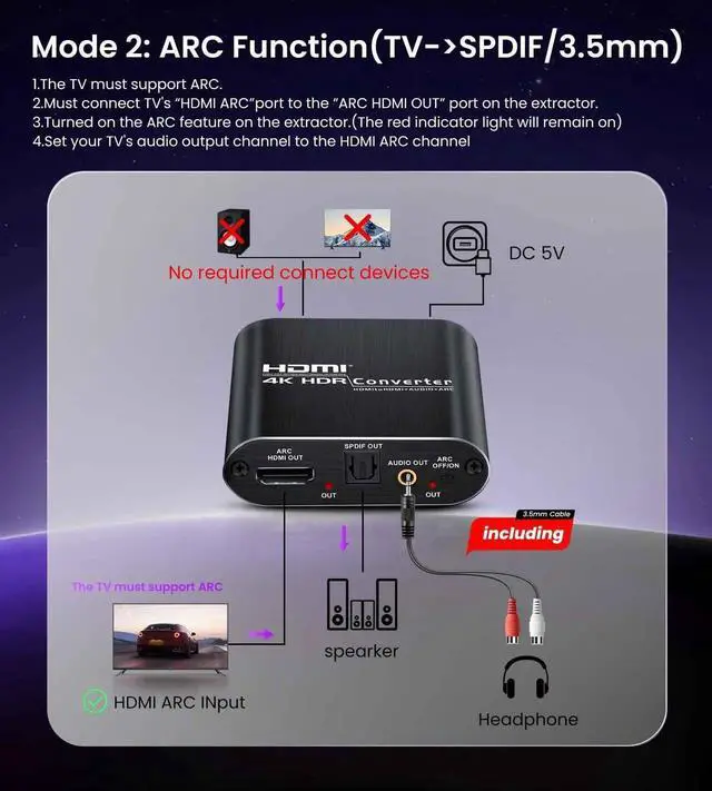 ARC (Audio Return Channel) Function: ARC lets your TV send audio to an external sound system (such as a soundbar or receiver) , allowing you to enjoy an immersive home theater experience instead of the poor sound of TV.