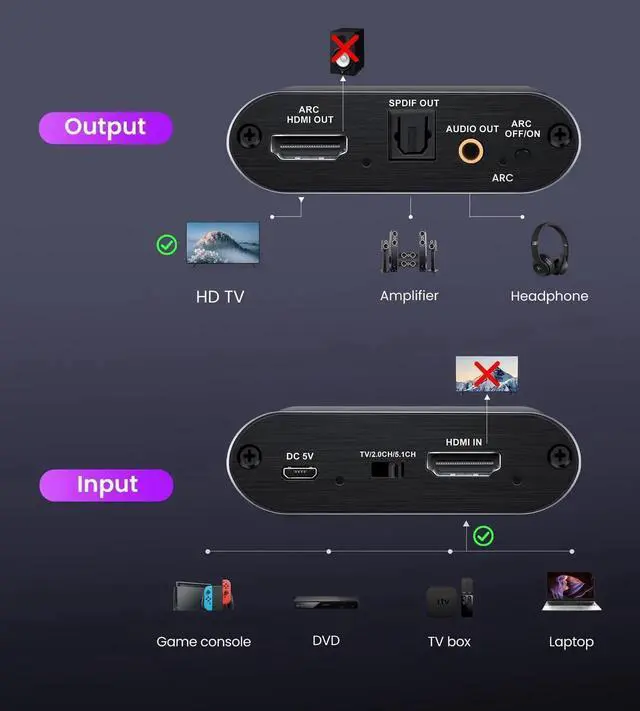 HDMI Audio Extractor: Support one HDMI input source to one HDMI output + optical toslink SPDIF and analog 3.5mm stereo audio output. (Tips: SPDIF and 3.5mm audio support output separately to soundbar, amplifier, headphone and other audio receiver without connecting TV / Monitor)