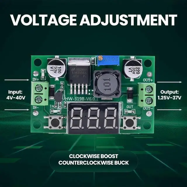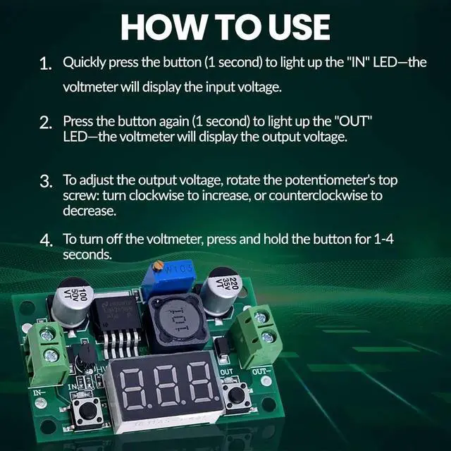 • LED Numeric Display: Buck converter equipped with an LED voltmeter display. The voltmeter has a measurement error of ±0.1V. The input voltage range is from 4.0V to 40V, and the output voltage range is from 1.25V to 37V(Note: If the input voltage is below 4V, the onboard voltmeter will not operate and no display will be shown). The voltmeter can be switched off by holding the switch for over 1 second and less than 4 seconds, then releasing it. Once the voltmeter is off, just press the switch briefly to turn it on