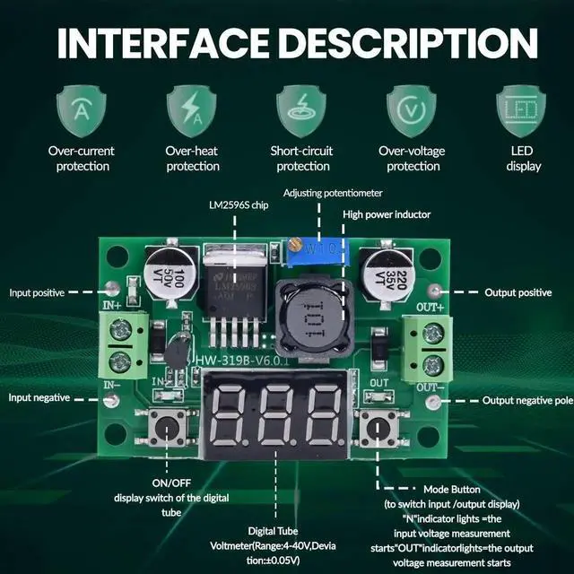2. Features & Safety: The input side of the LM2596 buck converter is protected by two diodes. If you connect it backwards, it won't damage the module. It also has overheat and short-circuit protection. (For power over 15W, make sure to improve heat dissipation)