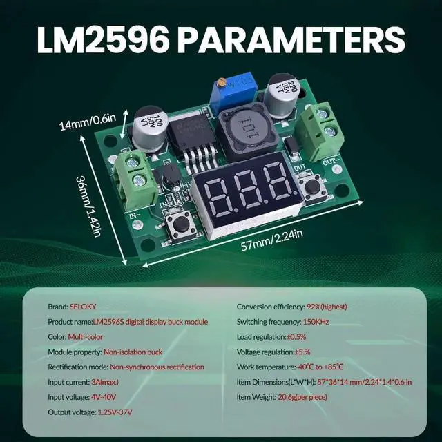 • LM2596 Adjustable Buck Converter: The internal oscillation frequency is 150KHz. It's a second-generation voltage regulator with low power consumption and high efficiency. It's equipped with high-quality solid capacitors to improve the stability and durability of the circuit and filter out high-frequency noise effectively