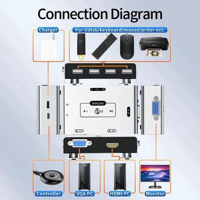 Unnlink VGA KVM Switch Hdmi Vga to VGA KVM 2 in 1 1080P 60Hz Video Switcher for PC Laptop PS/4/5 Xbox to TV Monitor Projector