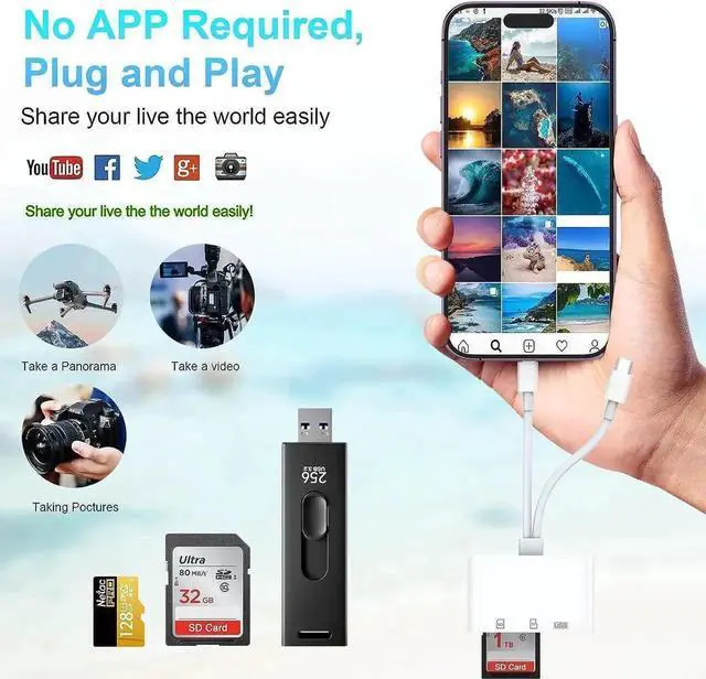 Broad Devices CompatibilityThis Universal card reader, compatible with iPhone 13/13 Pro/12/12 Pro/11/11Pro/XS /XS Max/XR/8/7, Pad4, Pad Air, Pad mini. Type-C for Samsung Galaxy S10 S9 S8 Note 9 8, LG G5 G6 V20, Google Pixel, Google Nexus 5X 6P, MacBook Air/Pro, Surface Pro 9/8, Huawei P9 10, Lumia 950, Lumia 950 XL/Moto Z and so on.