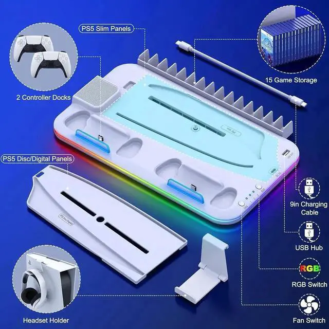 AN IDEAL PS5 ACCESSORIES --- PS5 station is perfectly compatible with PS5 Slim/Dualsense controller/Digital/Disc console. PS5 holder has an extra USB port, which allows to charge other devices like mouse, keyboard, headset, phone etc.. With a sleek and tidy design, PS5 accessories bundle saves much space to keep your all ps5 assecories like console, 2 controllers, 15 game discs, headset organized. Your must-have PS5 organizer!