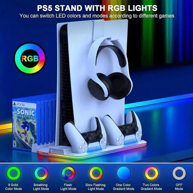 THE COOLEST PS5 COOLING STAND WITH RGB LED LIGHT --- The Playstation 5 stand has a circle of cool RGB lights, just press LED switch to choose 6 different LED modes. This is the COOLEST PS5 vertical stand for you! You can switch the LED colors and modes to build your own exclusive gaming ambiance and immerse yourself deeply in the world of games!