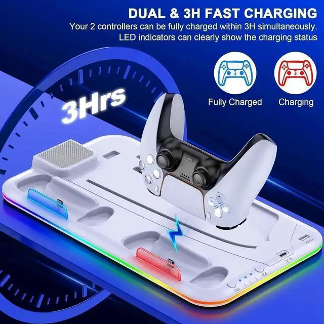 3H FAST CHARGING & MULTIPLE POWER SUPPLY METHODS --- Come with 9.06 inch C to C Charging Cable, PS5 stand with cooling fan and controller charger can fully charged 2 PS5 Dualsense controllers within 3H simultaneously. LED indicators clearly shows the charging status.