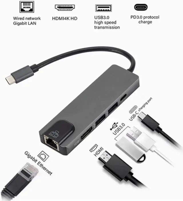 Output Port: 1x RJ45 Gigabit Ethernet Port, 1x HDMI-compatible, 2x USB3.0, 1x PD Charging, Support TV, Projector, Computer Monitor with HDMI-compatible-compatible Interface, etc.
