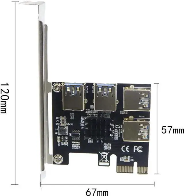 1-slot PCI-E 1X to 4 slot 16X riser card with high speed USB 3.0 cable, use for graphics card bitcoin mining. Plugs directly to the board without any extender cable, can be fixed to the case.