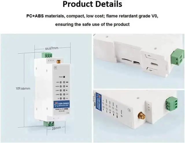 DIN-Rail mounting. Convenient cabling for installation, less space usage, and ease of use with other products. PC+ABS materials, compact, low cost; flame retardant grade V0, ensuring the safe use of the product.