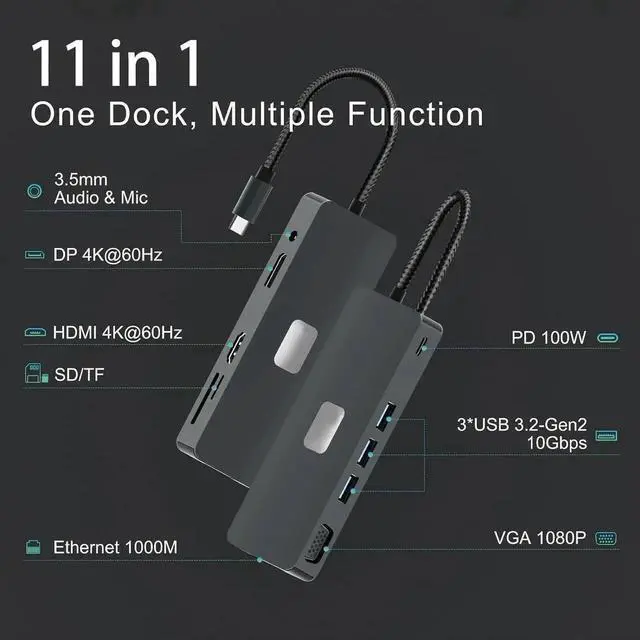With its HDMI (4K@60Hz), DP (4K@60Hz), and VGA (1080P 60Hz) ports, this USB C dock can connect up to three external displays simultaneously at the maximum output resolution of 1080P/60Hz. Whether you need to mirror your screen or extend your desktop, this laptop docking station has got you covered.