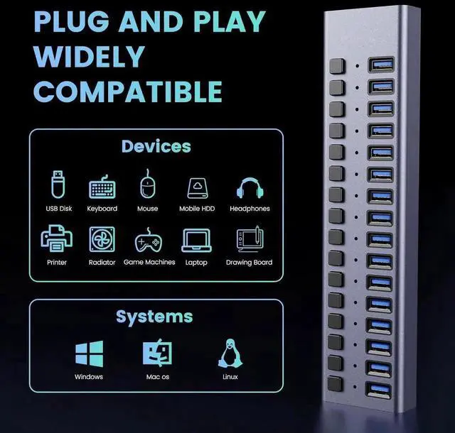 16-In-1 Powered USB Hub: Powered USB 3.0 hub with 16 USB ports, could expand 1 USB port to 16 external USB 3.0 data ports for keyboard, mouse, card reader, hard drivers, USB Flash drive, printer and more, which will be a good substitute that can easily help you arrange your home and office.