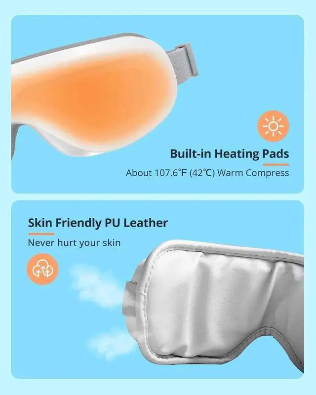 Soothing Heating Massage. Get your eyes relaxing. The eye massager adopts compression and vibration to massage your whole eyes and upper face. Built-in heating pads provide a comfortable temperature up to 107 degrees Fahrenheit (42). A thoughtful fathers day gift from wife/daughter/son.