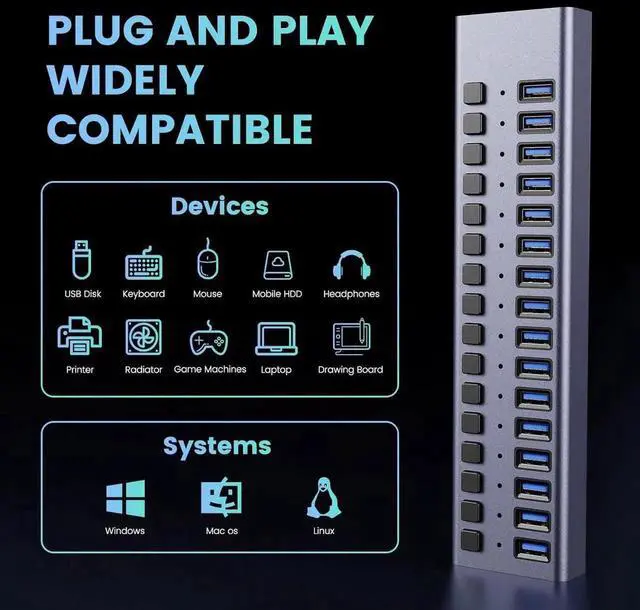 Wide compatibility - The powered USB Hub is compatible with most operating systems: Windows XP/Vista/7/8/10, MacOS-8/9/X, UNIX, Linux to offer PLUG-AND-PLAY convenience.