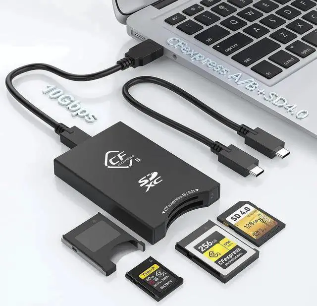 Read Professional CFexpress Type B/ Type A & UHS-II SD Card Reader SimultaneouslyDual-Slot professional CFexpress memory card reader can simultaneously read and write on 2 memory cards: CFexpress Type B Card / CFexpress Type A Card and UHS-II SD Card. CF express cards type b card reader would be a good companion for professional filmmakers, photographers & content creators.