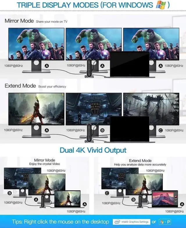 Triple Extend to the Fullest \u2014 Boost productivity by casting up to 3 different contents on displays; Actual pixels up to 4K@30Hz when using a single HDMI port, 1080P@60Hz when using 2 or 3 in Windows system. Enjoy efficient data transfer and fast charging through all high speed ports.