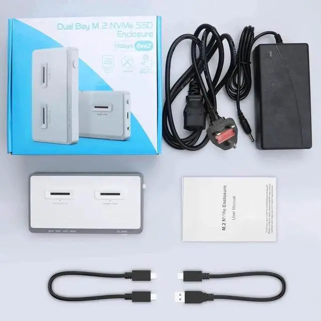 Package include: Dual-Bay NVME Docking Station; 12V/3A Power adapter; USB A to C cable; USB C to C cable; User manual. If you have any questions, please contact our customer service on NE, we will solve it ASAP.