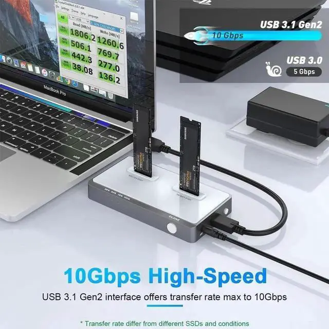 4\u20e3One-Key Offline Clone Easy OperationThis tool-free SSD Dual-bay docking station is easy to operate, tool-free, plug&play and hot swap, without any driver or software for operation. Can reader two M2. NVME SSDs at the same time by connect with computer with a USB cable, or offline clone mode with click the clone button for 3 seconds to clone all data of source ssd to target ssd.