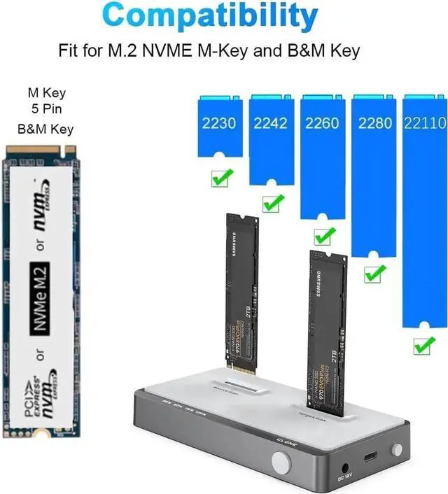 2\u20e3Portable External Storage & High SpeedThis M. 2 hard drive enclosure is specially designed for M/B&M Key NVMe PCIe SSD(22110/2280/ 2260/ 2242). High performance, 10Gbps high speed, it support 2 8TB SSD capacity to transfer data. And M. 2 hard disk reads and writes speed of most M2 NVMe SSDs is 992M/S. Offline clone or to expand storage capacity by connecting PC, Laptop computers, smart TVs, PS4, XBOX and other devices.