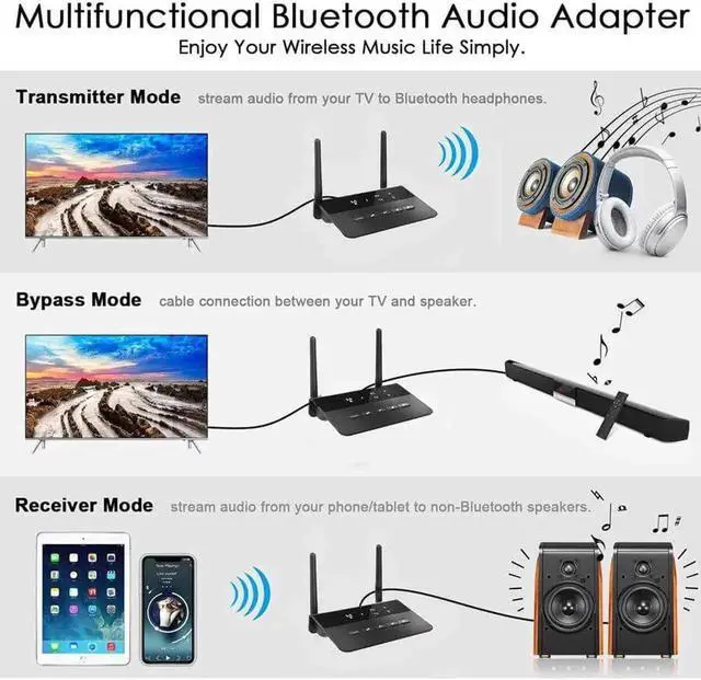 262FT Ultra Long Range Utilizing the latest Bluetooth 5.0 technology and dual antennas design, Our Bluetooth transmitter / receiver can achieve a range of up to 262ft (80m) line-of-sight in open air and up to 80-110ft(25-35m) indoors, which ensures a stable connection without losing signal wherever you go in your big house. *NOTE: Operation range can be affected by Wi-Fi routers, wireless TV adapters and also depends on the receiving devices.