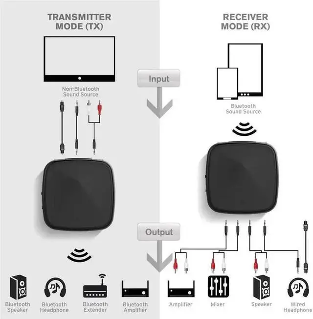 Transmitter & ReceiverThe Bluetooth adapter is a transceiver designed for 2-way high quality remote audio streaming. It brings new life to traditional electronics like home speakers, wired headphones to receive wireless music from cellphones, tablets, laptops, etc. It also can be a transmitter for TV, computers, etc. to connect those Bluetooth enabled system like Bluetooth speakers, Bluetooth earphones. Small, simple as it is, this black gadget is lightweight, durable and magical.